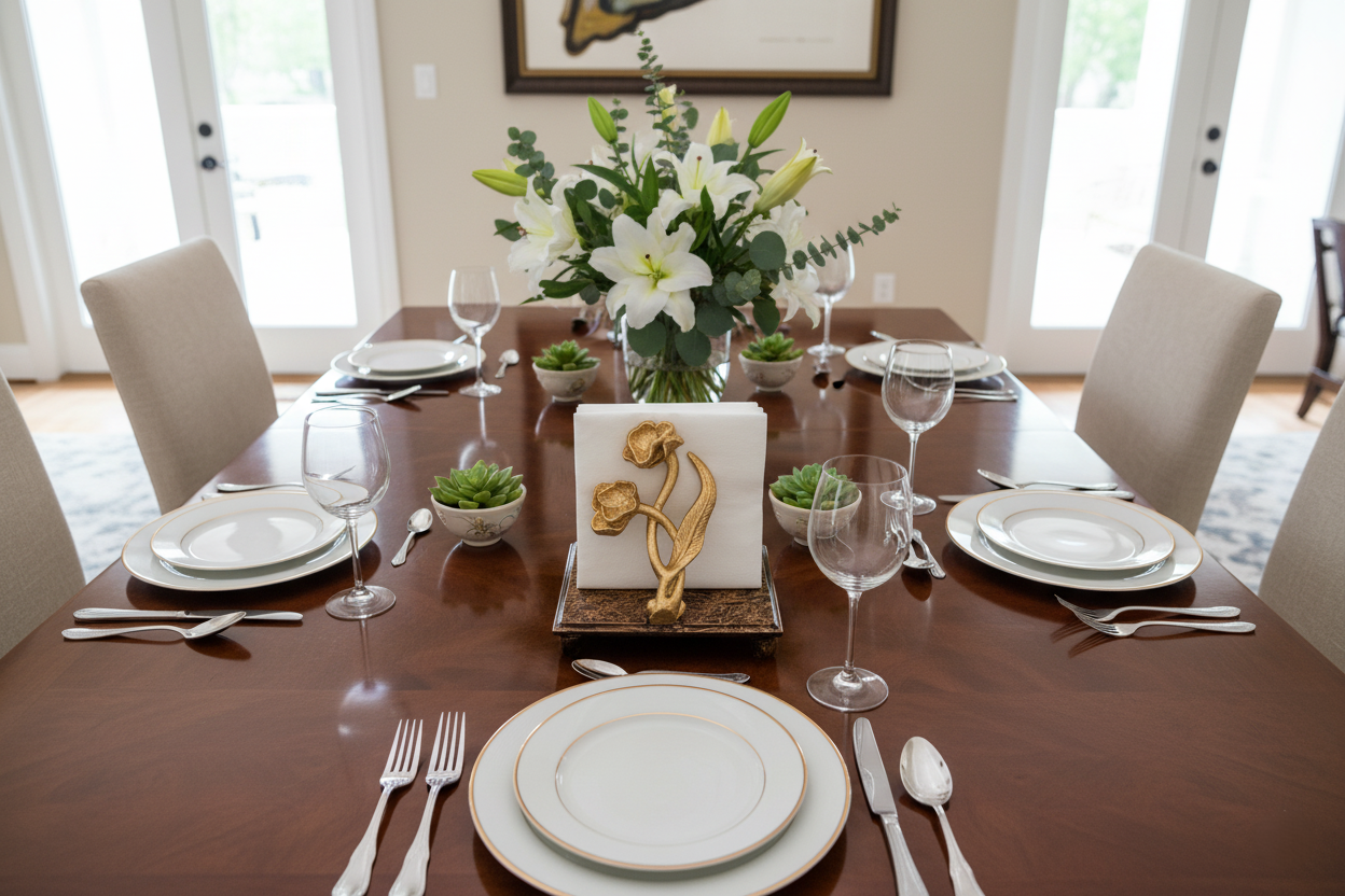 Each piece is lovingly handcrafted, blending delicate artistry with golden elegance. Our trays and napkin holders are made to turn simple gatherings into cherished memories, adding warmth and soulful beauty to every space they grace.